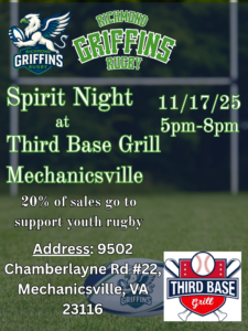 The Richmond Griffins Youth Rugby Club invites all players, families, and supporters to join us for a Spirit Night Fundraiser at Third Base Grill in Mechanicsville!