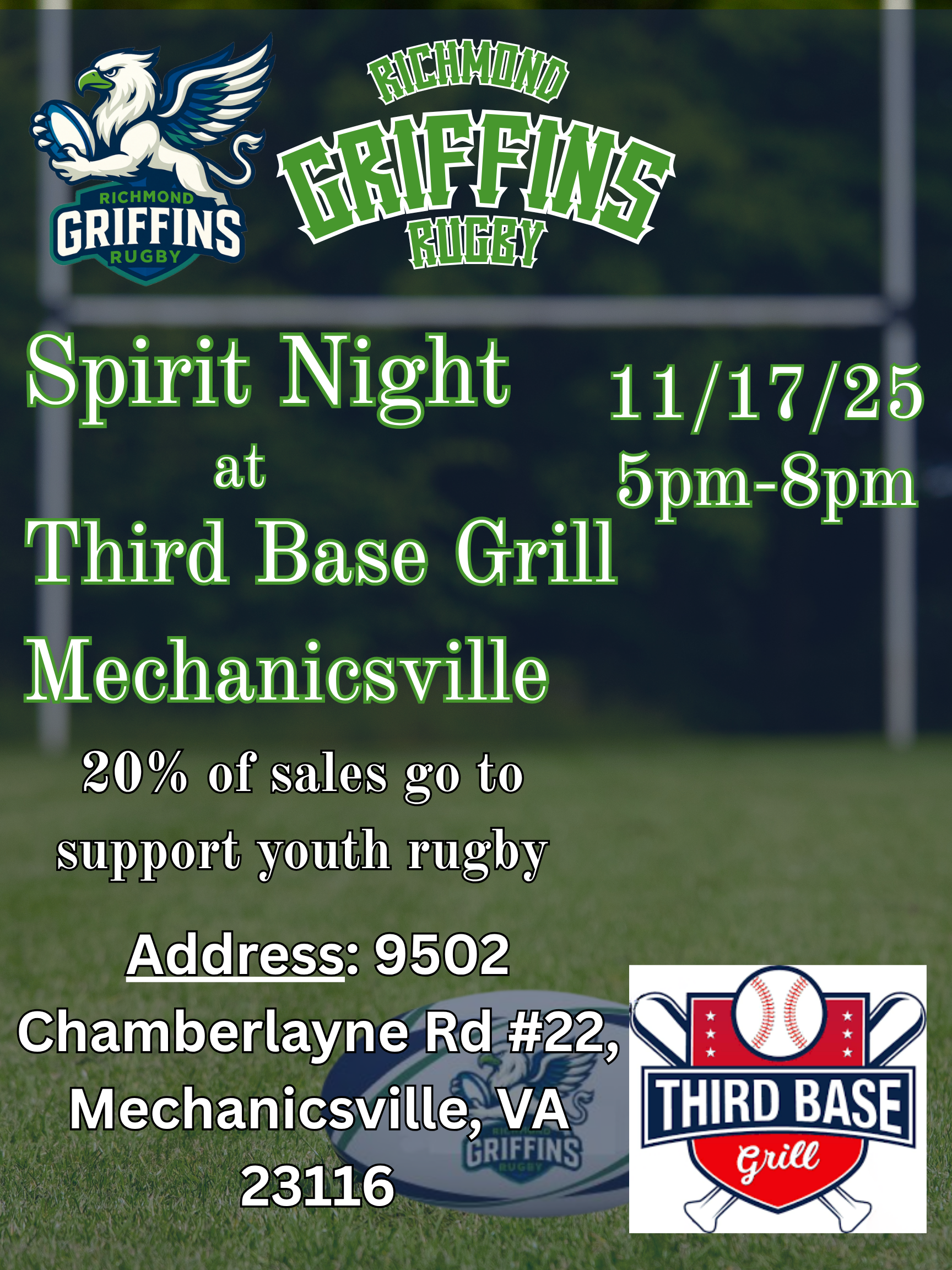 📅 Monday, November 17, 2025 | 🕔 5:00 PM – 8:00 PM📍 Third Base Grill — 9502 Chamberlayne Rd #22, Mechanicsville, VA 23116 The Richmond Griffins Youth Rugby Club invites all players, families, and supporters to join us for a Spirit Night Fundraiser at Third Base Grill in Mechanicsville! Come out and enjoy a great…